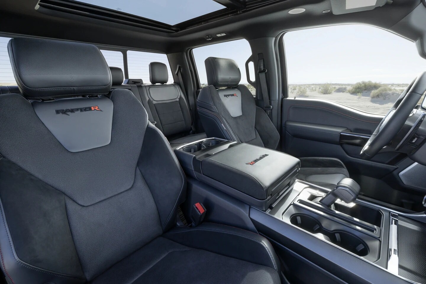 Style and capability carry over into the interior of this masterful off-road pickup. While trekking over some of the world's most brutal surfaces in the F-150® Raptor R, ™ you'll be comfortably and securely supported by race-inspired RECARO® front seats with leather insert seating surfaces.